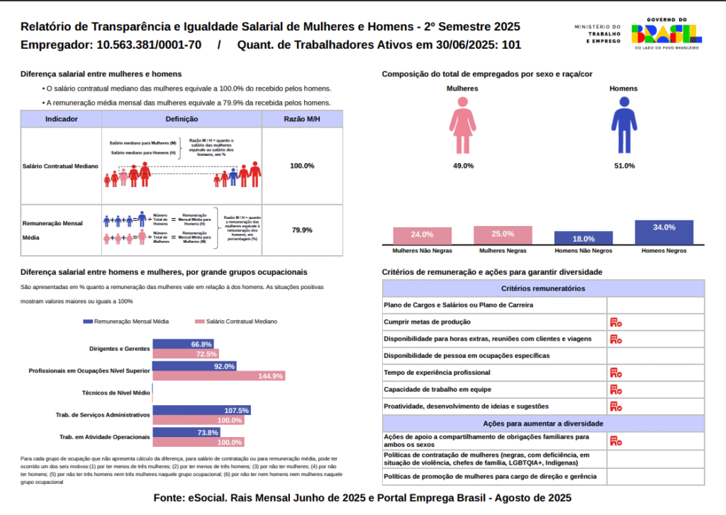 Esse documento, elaborado pelo Ministério do Trabalho e Emprego (MTE), tem como base as informações fornecidas pelo eSocial e pela declaração de igualdade salarial enviada por meio do Portal Emprega Brasil.