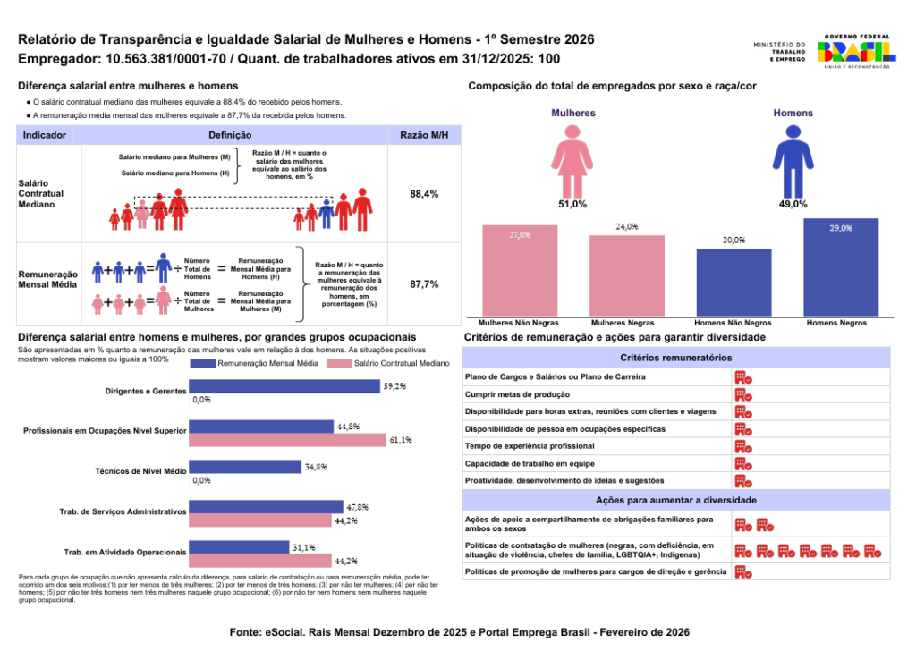Esse documento, elaborado pelo Ministério do Trabalho e Emprego (MTE), tem como base as informações fornecidas pelo eSocial e pela declaração de igualdade salarial enviada por meio do Portal Emprega Brasil.